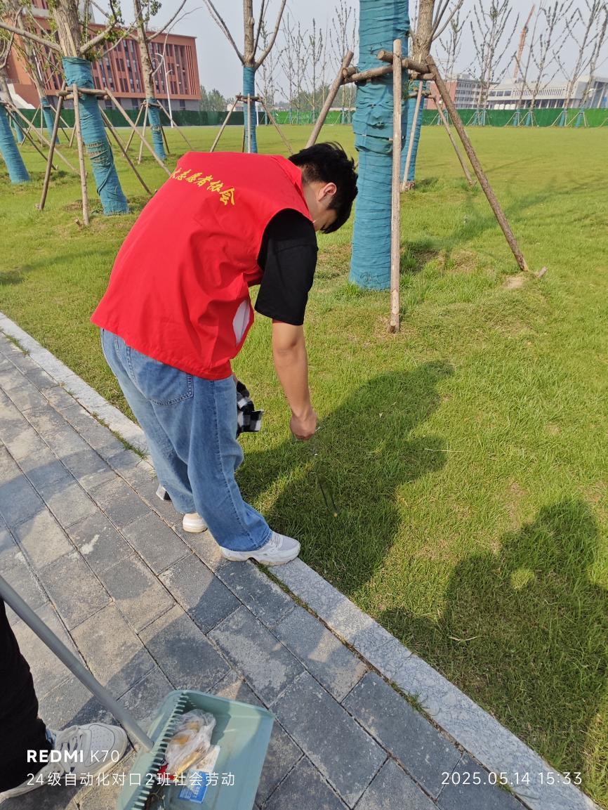 在实践环节中,学院轮值班级学生对图书馆前公共卫生区域进行了全面清洁。他们手持扫把、垃圾钳等工具,分工协作、干劲十足,不放过任何一个死角,用实际行动践行“劳动创造美”的理念。